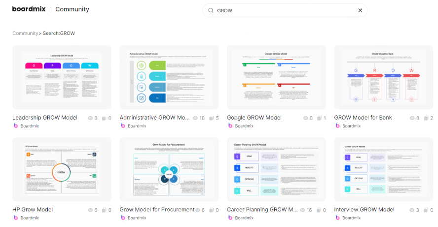If you’re short on time or not sure where to start, pre-built templates are a game-changer. Boardmix offers a library of GROW Model templates designed for real-world scenarios, so you don’t have to start from scratch. Whether you’re planning your career, preparing for an interview, developing leadership skills, or managing a team project, there’s a template tailored to your needs.