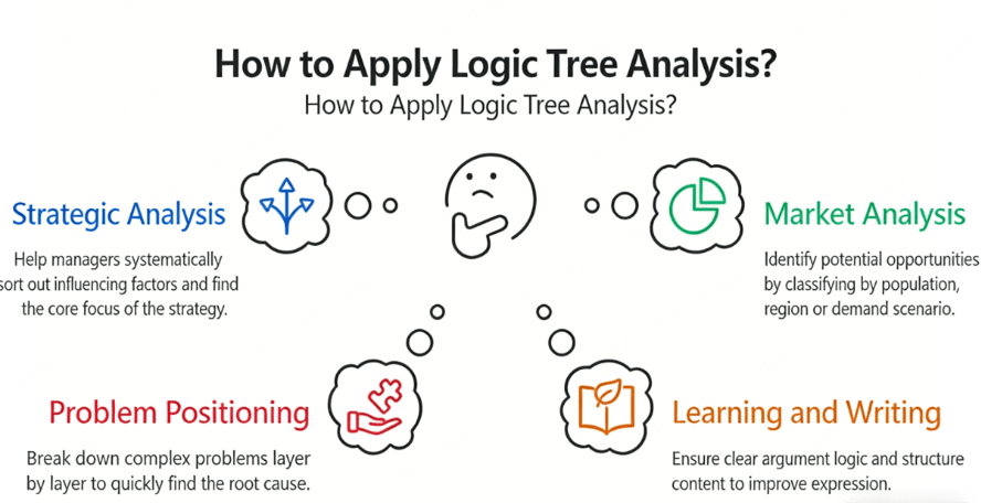 Logic Tree Analysis not only helps establish a clear thinking framework but also significantly boosts efficiency in problem analysis and decision-making. Whether applied to corporate strategy, market exploration, or personal learning and communication, the logic tree serves as a powerful cognitive tool. Mastering this method will enable you to think more systematically and communicate with greater clarity, logic, and professionalism.