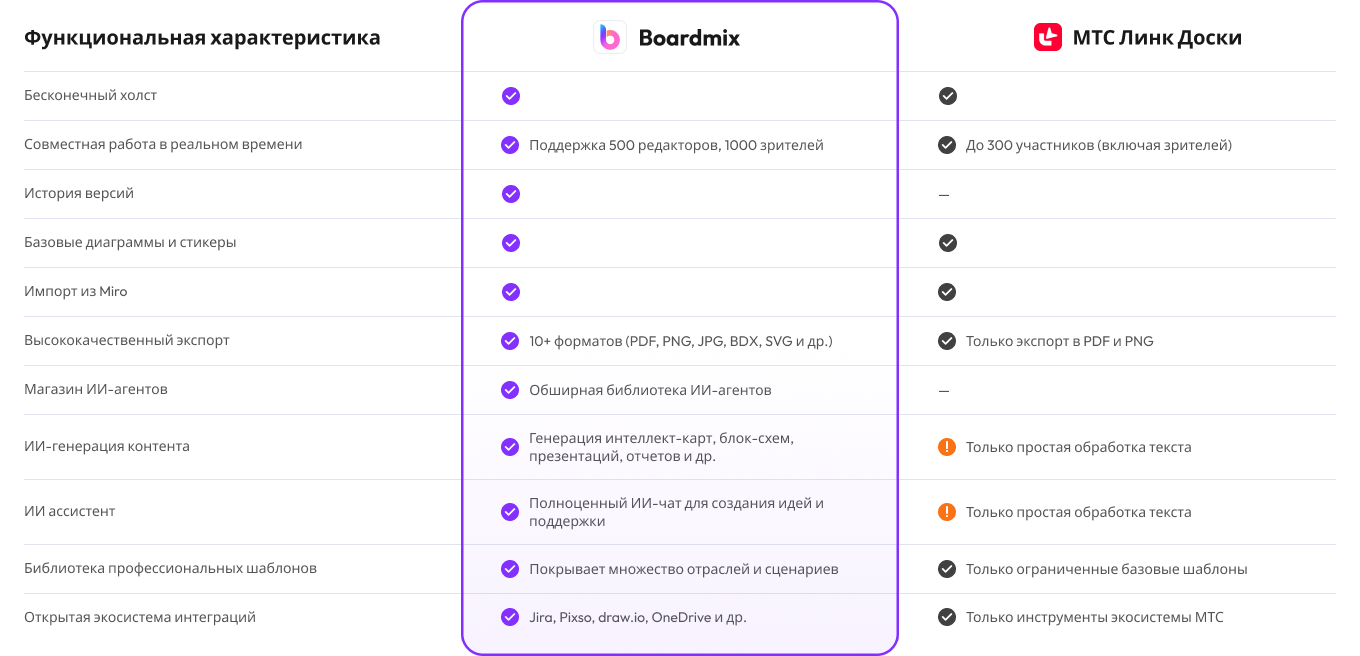 Главное отличие заключается в масштабируемости, открытости экосистемы и глубине ИИ-инструментов. В то время как МТС Линк Доски ограничивает интеграции своей внутренней экосистемой, Boardmix предлагает открытую интеграцию с популярными инструментами: Jira, Pixso, draw.io, OneDrive и другими. Кроме того, Boardmix обладает обширной библиотекой профессиональных шаблонов для любых отраслей и поддерживает функцию «История версий», которой нет у конкурента. Это делает Boardmix более мощным выбором для профессиональных команд.